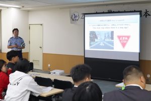 ごみの分別方法や収集日程、交通ルールや日常生活における注意点などが具体的に説明され、新入生は真剣な面持ちで聞き入っていました。